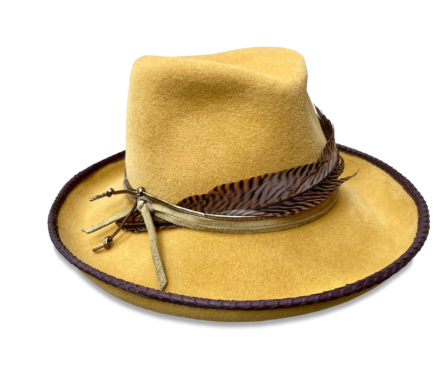 A top selling fedora featuring a slightly upturned 3.25" brim piped with leather for style and durability. Available in Rich Vienna Gold or Teal furfelt. Trimmed with layered cord and a long pheasant tail that wraps around the crown. This hat is very flattering and easy to wear while also being an attention getter. All felts hats come with a satin lining. 4" Crown. 100% Furfelt. All hats are made to order in NYC.