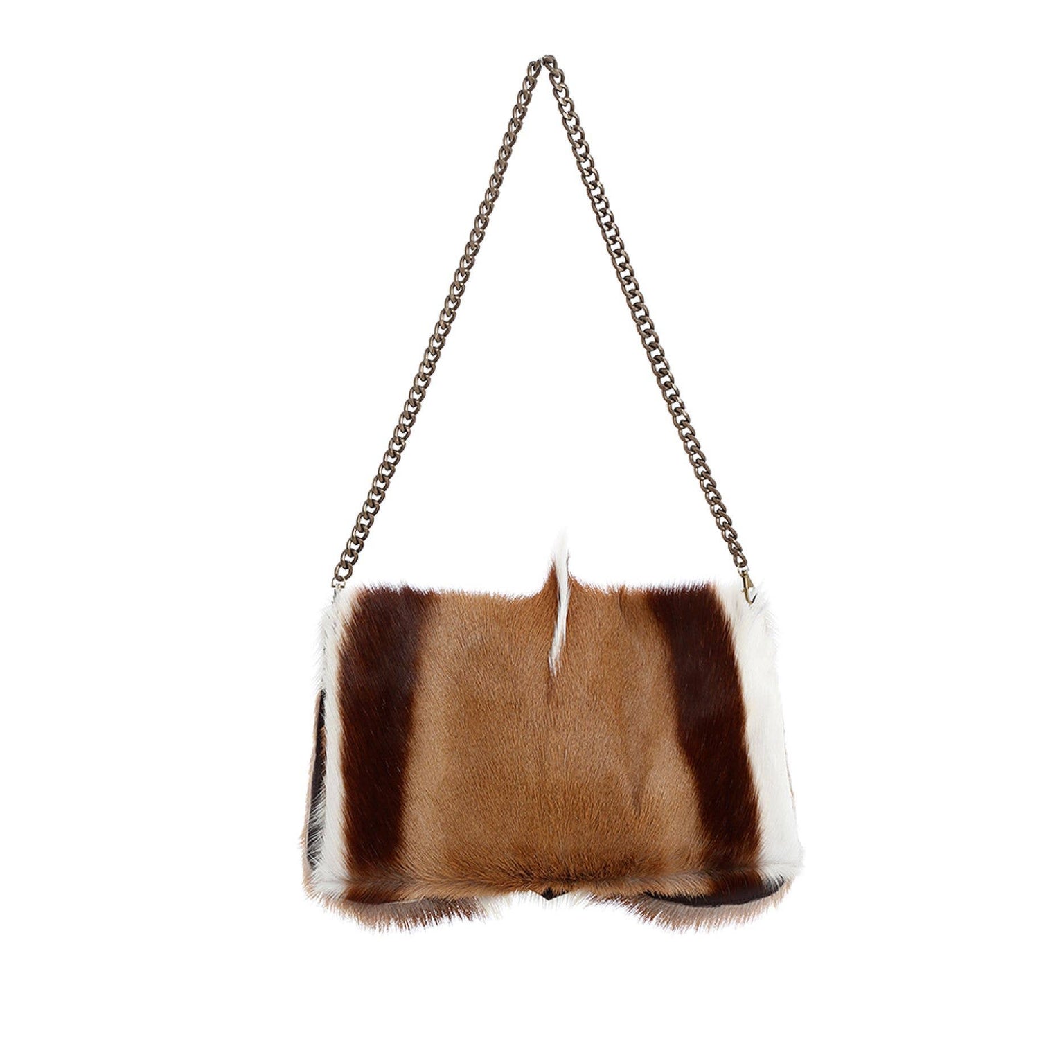Unique hair on hide bag you can use as an oversized clutch or shoulder bag. Handmade in our atelier with springbok leather at the front and the back. With a removable golden metallic chain for wearing it on the shoulder. It’s a superb accessory for a special event. Available in natural color or animal print fantasy finish. MEASURES: Width: 15 inches/38 centimeters. Height: 9,45 inches/24 centimeters. Depth: 0,78 inches/2 centimeters. Chain length: 43,30 inches/90 centimeters