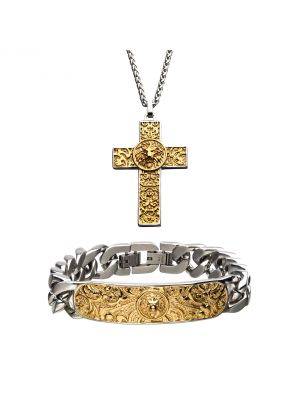 Men's Matching Jewelry Consist of Stainless Steel and Gold Plated Nymeria Lion Engraved ID Curb Chain with Fold Over Clasp Bracelet. 8 1/2 inch long includes 0.5" Self Adjustable Link, Stainless Steel Gold Plated Nymeria Lion Cross Pendant with 24 inches long Steel Wheat Chain